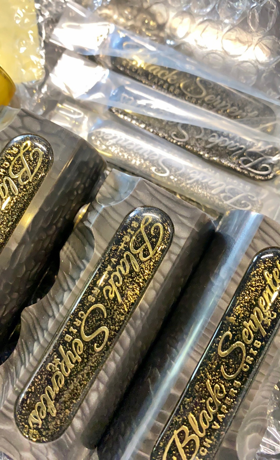 店長長年の夢【Black Serpentes Black Juma✨】作って頂きました🎉 🎉🎉 しかもRVCC初21700🔋バージョン。そしてワガママにもゴールドロゴとシルバーロゴ2種のラミネートプレート付!アトマイザーに合わせて付け替えてください😆 2月中旬入荷予定✨