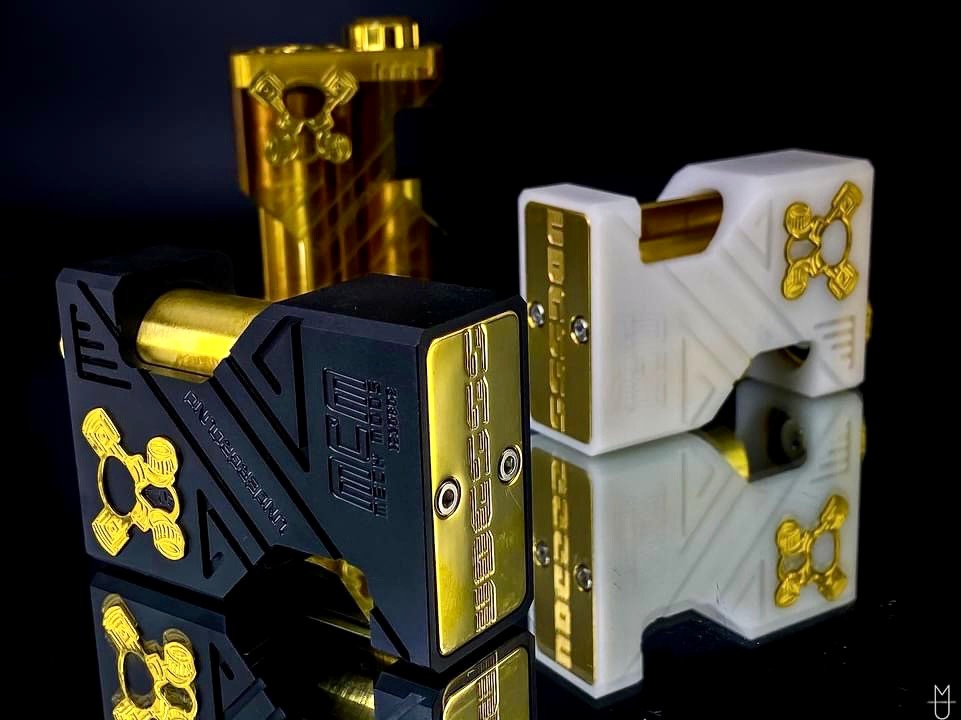 銀肌に映えるため息が出るほど美しいエングレービング。ハイグレードT6アルミニウムボディにブラックデルリンのコンビがハイセンス過ぎる21700デュアルパラレルBOX MOD。入荷済✨ ※Sold Out