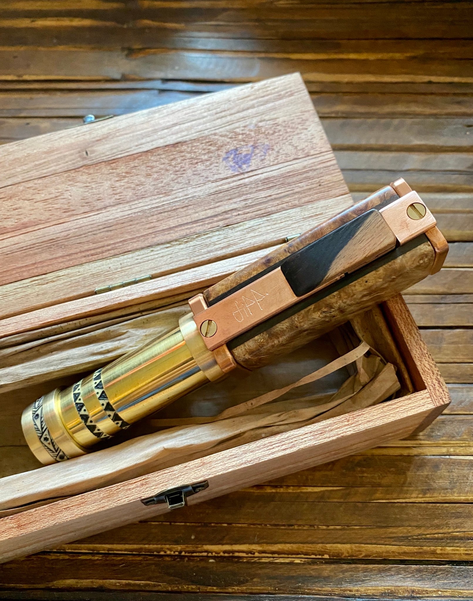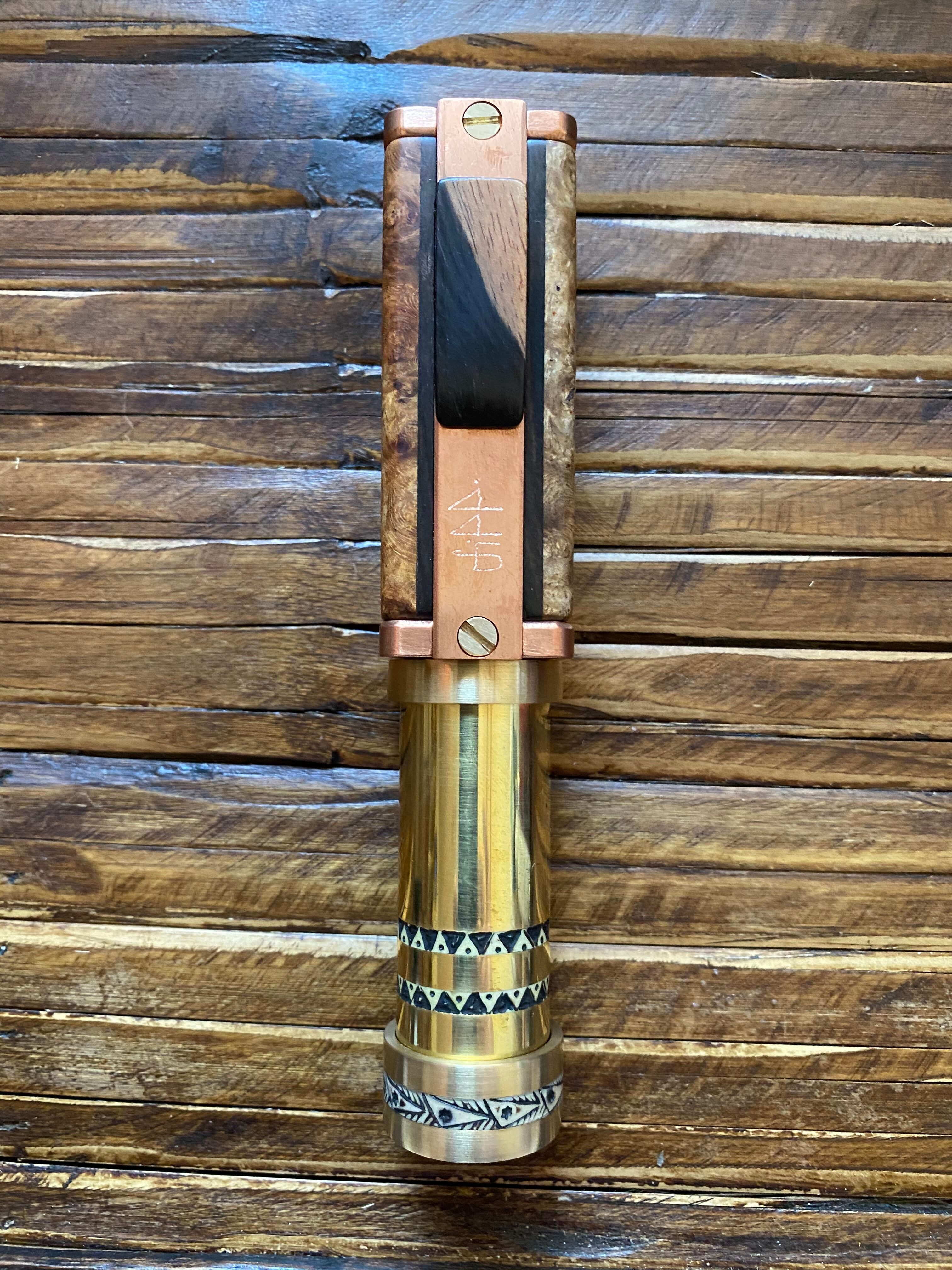 ウクライナ産 Amboynaスタビをメインにスイッチと背面彫刻部分はカマゴンウッド。インターナルは全てSolid Copperを使用しています。