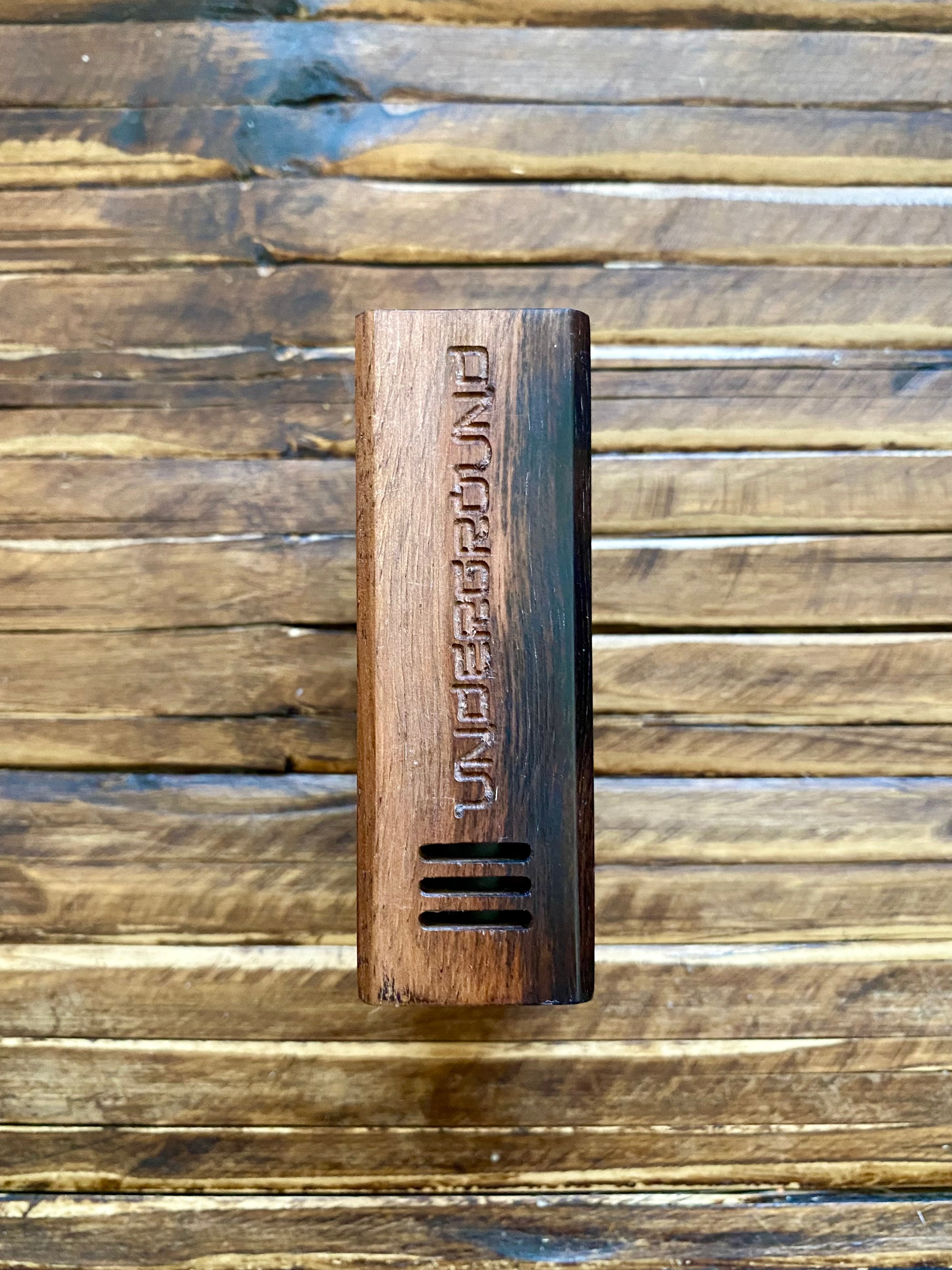 タイガーカマゴンと呼ばれる黒と茶の混ざりあった柄がモダンアートのようです。エンブレムは小さく右下に。木の風合いと手触りをぜひお楽しみください^ ^
