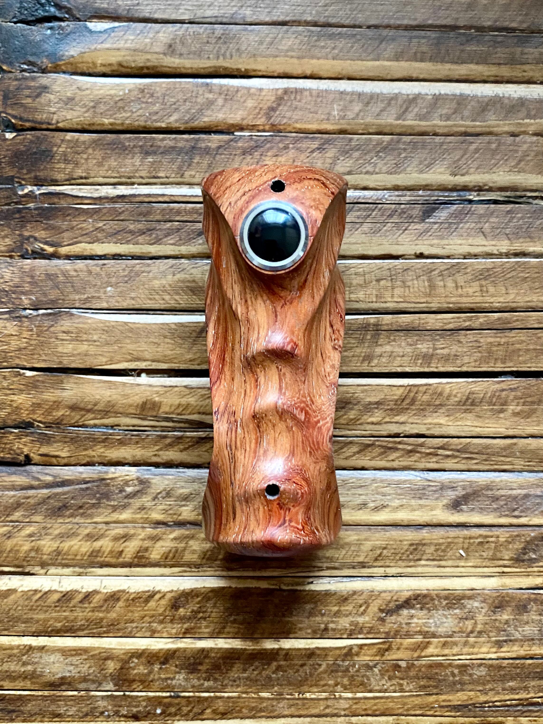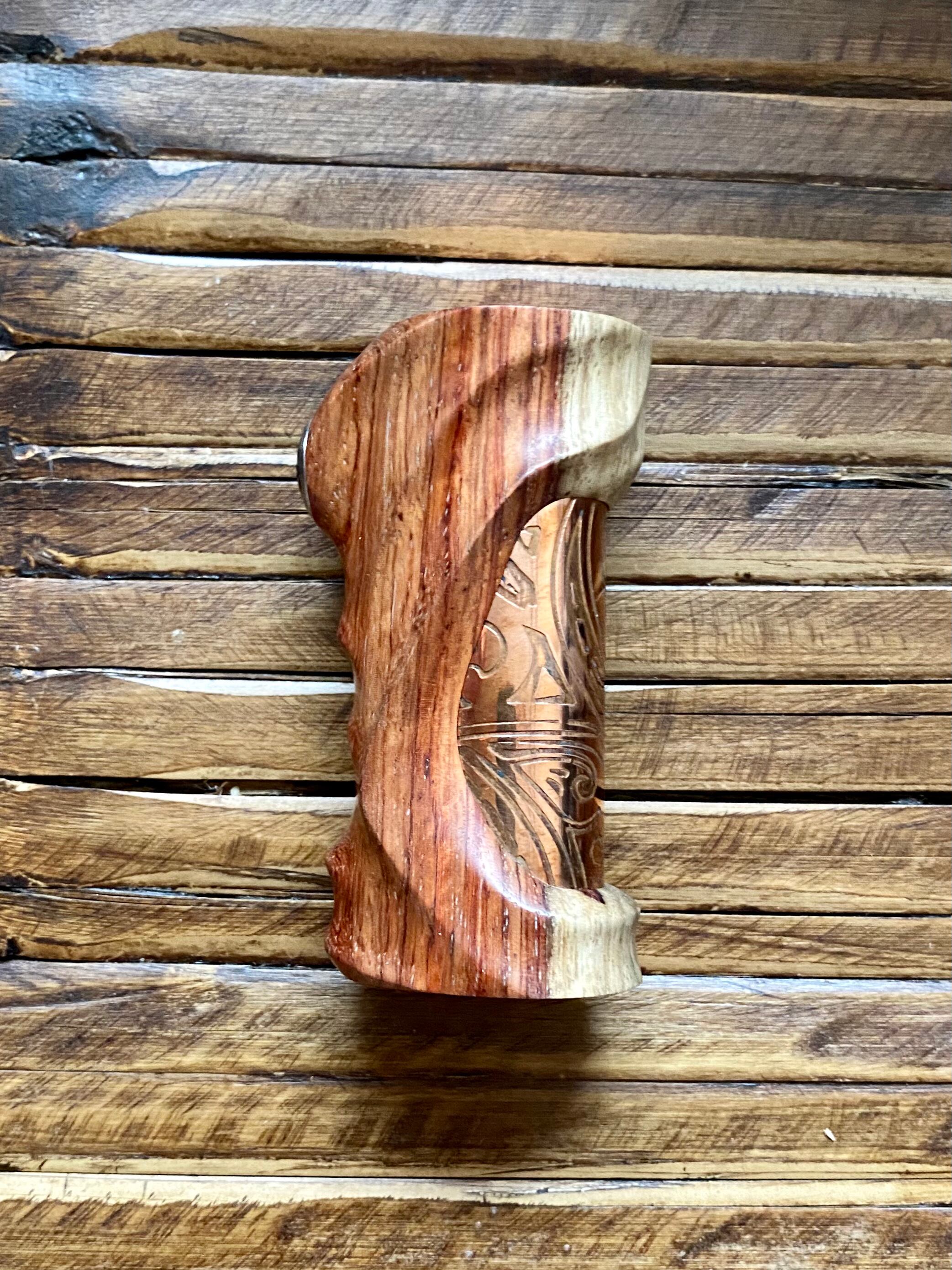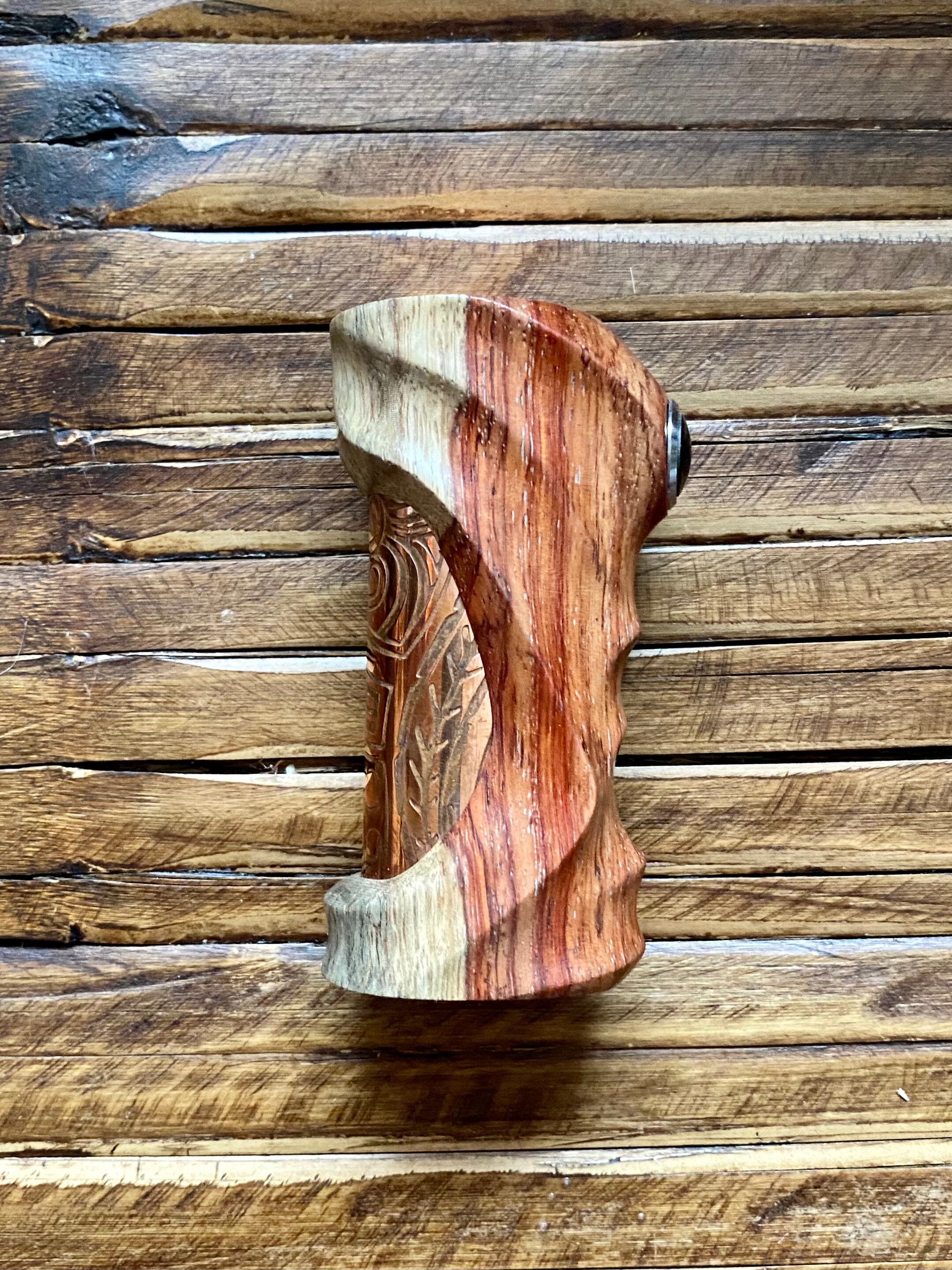 LKC新作は赤と白の配色が美しいNarra Woodを使用した18650シングルMOD。硬いブロックを抜群のセンスで削り出し、手作業によるカーヴを施した魂の作品。