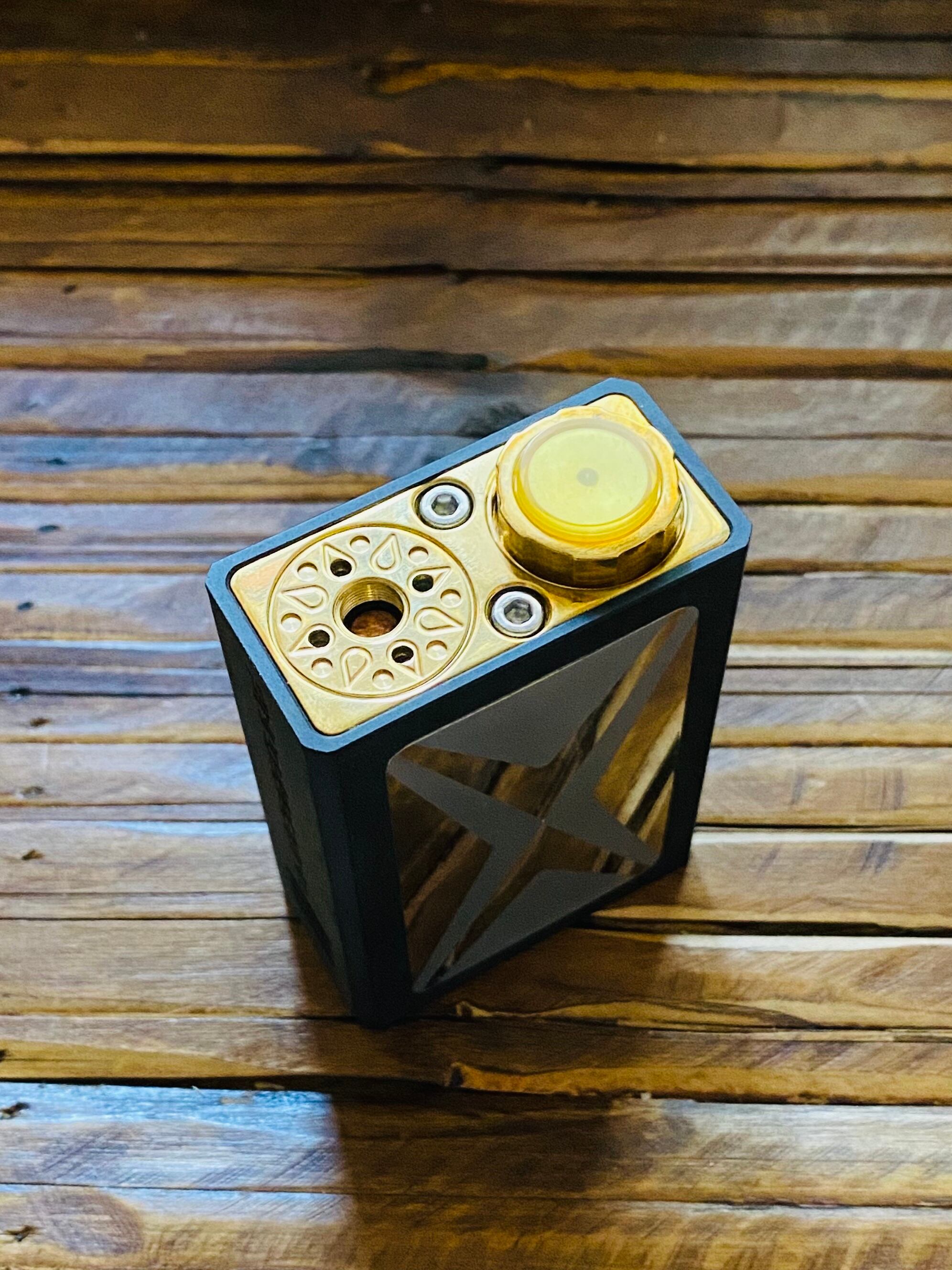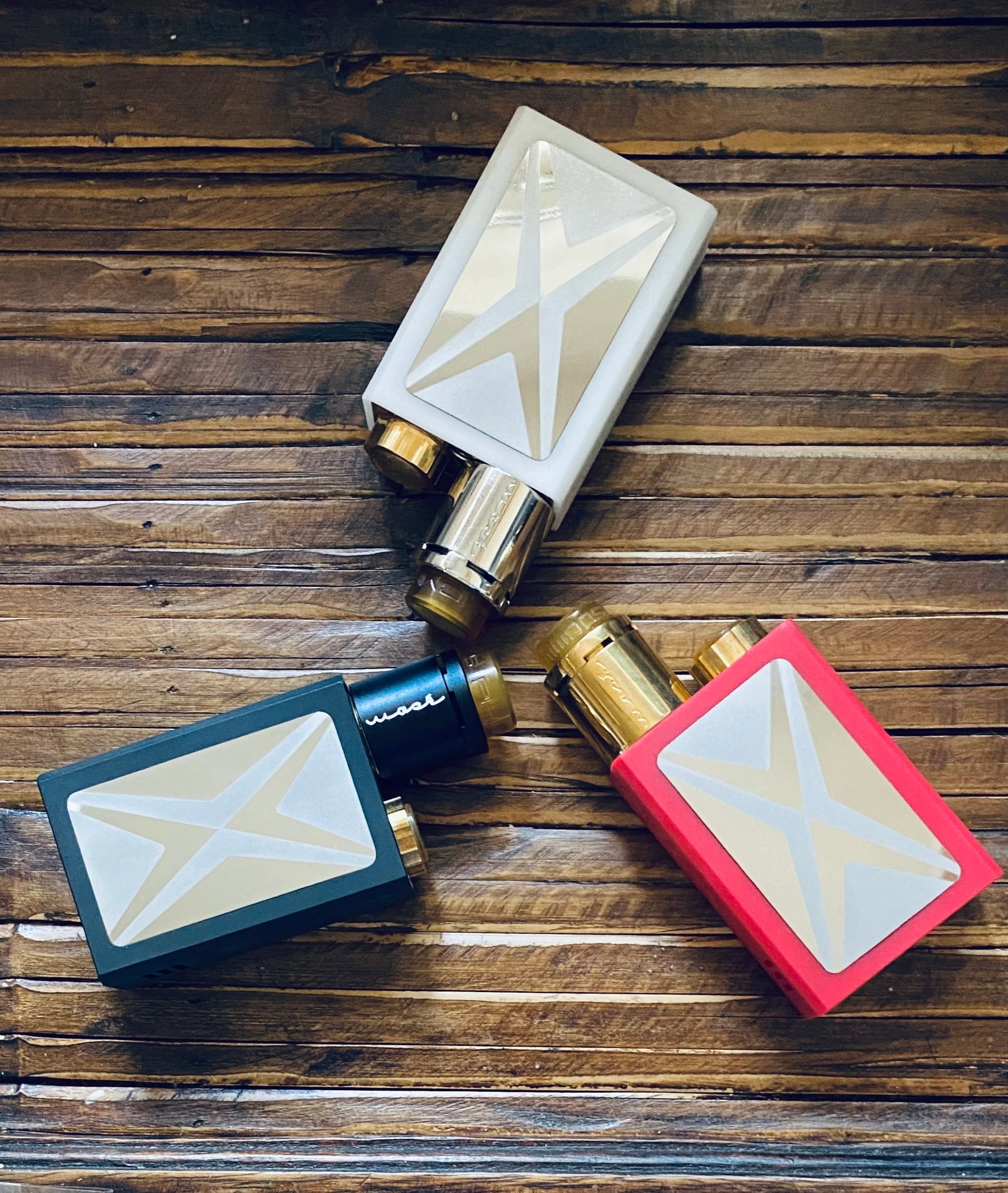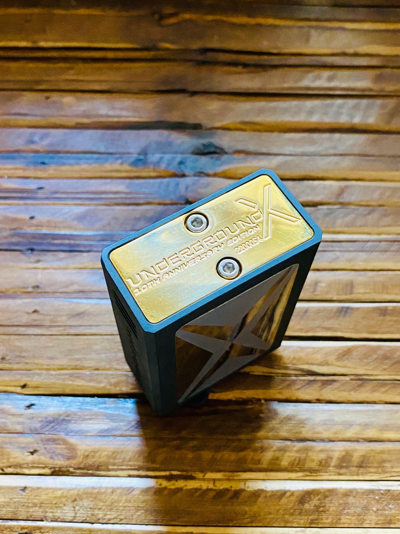 型は定番のシリーズBOX MOD【UDG V】ですが、Xデザインのミラープレートとブラスボトムプレートの刻印が特別仕様。